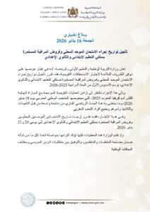 أصدرت وزارة التربية الوطنية والرياضة بلاغا اخباريا بتاريخ الجمعة 16 يناير 2026 حول تأجيل تواريخ إجراء الامتحان الموحد المحلي وفروض المراقبة المستمرة بسلكي التعليم الابتدائي والثانوي الإعدادي.
