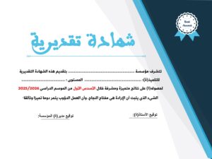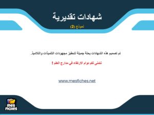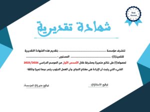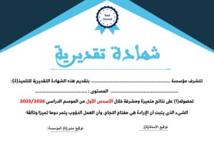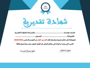 نقدم لكم شهادات تقديرية (نموذج2) بحلة جذابة والتي تهدف بشكل أساسي إلى تحفيز مجهودات التلميذات والتلاميذ والاحتفاء بالنتائج المتميزة والمشرفة التي يحققونها، خاصة خلال الأسدس الأول من الموسم الدراسي 2025/2026. تتضمن النماذج عبارات تشجيعية تؤكد على أن الإرادة والعمل الدؤوب هما مفتاح النجاح والتألق، كما توفر مساحات مخصصة لتدوين اسم التلميذ، المستوى الدراسي، وتوقيعات الإدارة والأساتذة، مما يجعلها أداة تربوية متكاملة لدعم التميز الدراسي.