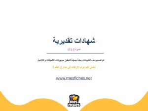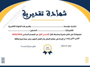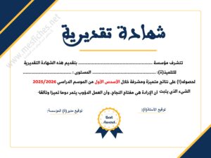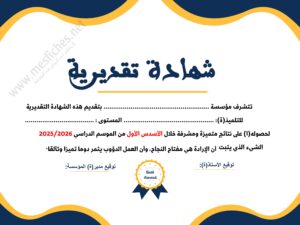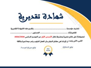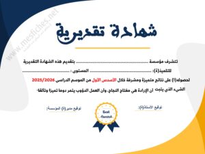 نقدم لكم شهادات تقديرية بحلة جذابة والتي تهدف بشكل أساسي إلى تحفيز مجهودات التلميذات والتلاميذ والاحتفاء بالنتائج المتميزة والمشرفة التي يحققونها، خاصة خلال الأسدس الأول من الموسم الدراسي 2025/2026. تتضمن النماذج عبارات تشجيعية تؤكد على أن الإرادة والعمل الدؤوب هما مفتاح النجاح والتألق، كما توفر مساحات مخصصة لتدوين اسم التلميذ، المستوى الدراسي، وتوقيعات الإدارة والأساتذة، مما يجعلها أداة تربوية متكاملة لدعم التميز الدراسي.