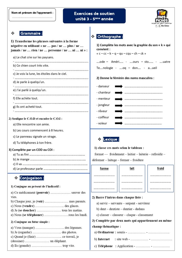 Exercices de soutien et de consolidation en langue française – 5ème année du primaire – Unité 3